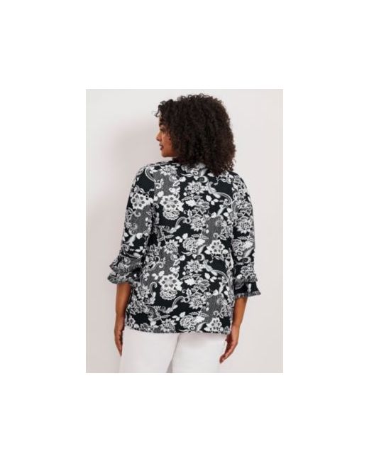 This floral-printed knit top features tiered ruffle sleeves with a subtle frayed finish. The frayed edges give it a slightly relaxed, boho-chic appeal, making it a stylish yet comfortable option Fabric: Soft stretch cotton that holds its color and shape beautifully — and stays that way, wash after wash. Fit: Relaxed fit. V-neckline. 3/4 length sleeves. Care: Machine Wash Key Features Include: Suprema 95% Cotton 5% ELASTANEImported. Length: 30". Plus Sizes 14-36Avenue