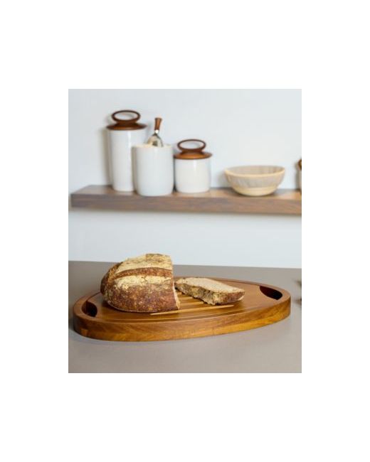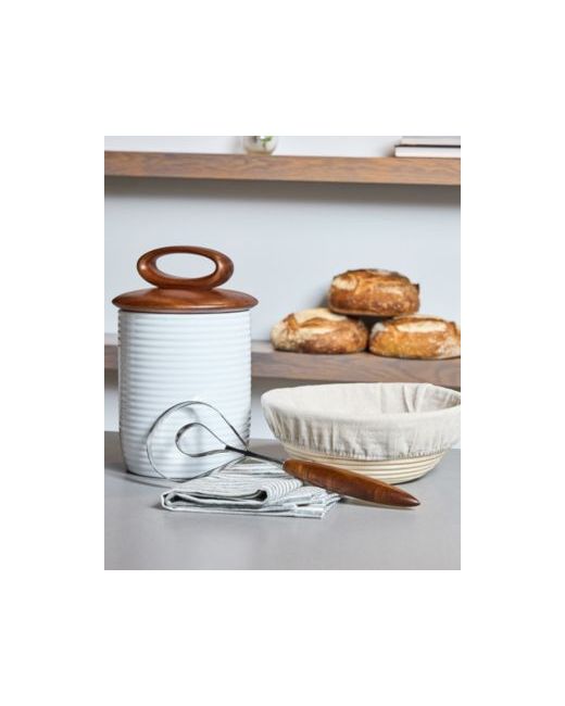 Keeping your baking ingredients fresh, this Nambe large canister features a stoneware body and an acacia wood lid with a silicone seal. The generous open handle allows for ease of use while combining recipe components.