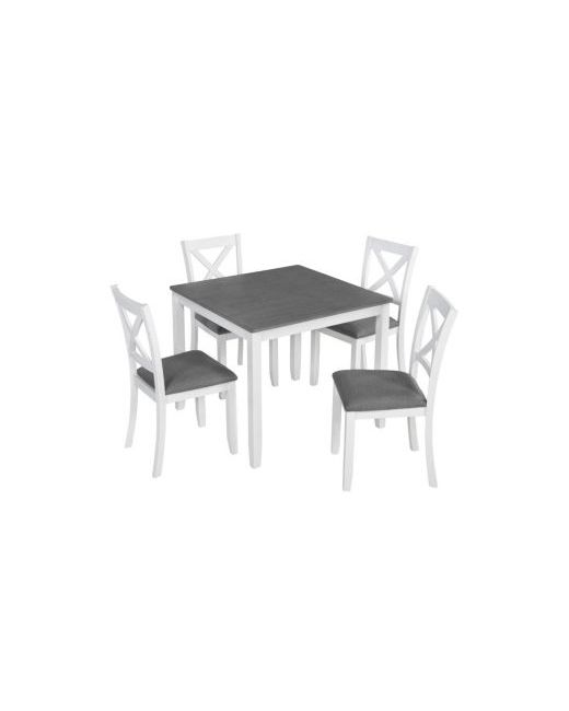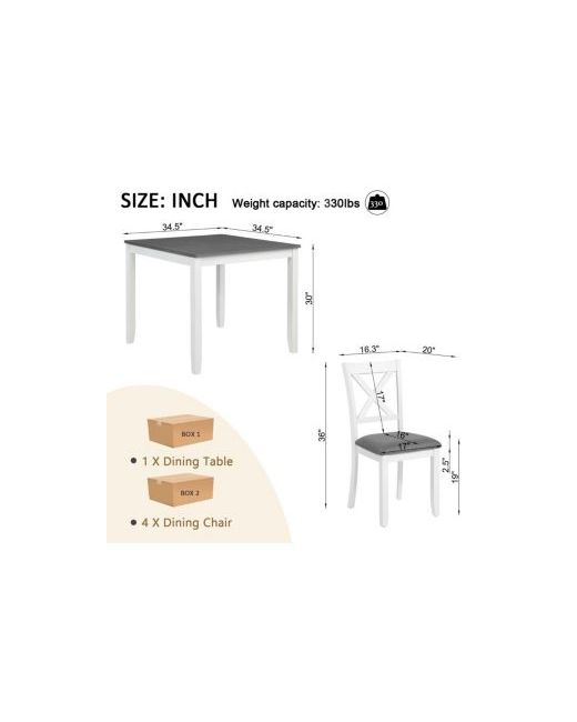 Brighten up your kitchen or dining space with the Frostvale 5-Piece Modern Dining Set. Featuring a crisp white frame and sleek gray tabletop, this dining set brings a clean, minimalist look perfect for small apartments, kitchen nooks, or modern dining rooms. The 34.5" x 34.5" square table is crafted from sturdy rubber wood with a waterproof Mdf surface that's easy to clean. The four chairs offer cushioned comfort with X-back support and wear-resistant fabric. Non-slip feet protect your floors, while the space-saving design keeps your layout neat. Easy assembly and built to last—ideal for everyday meals and stylish gatherings.