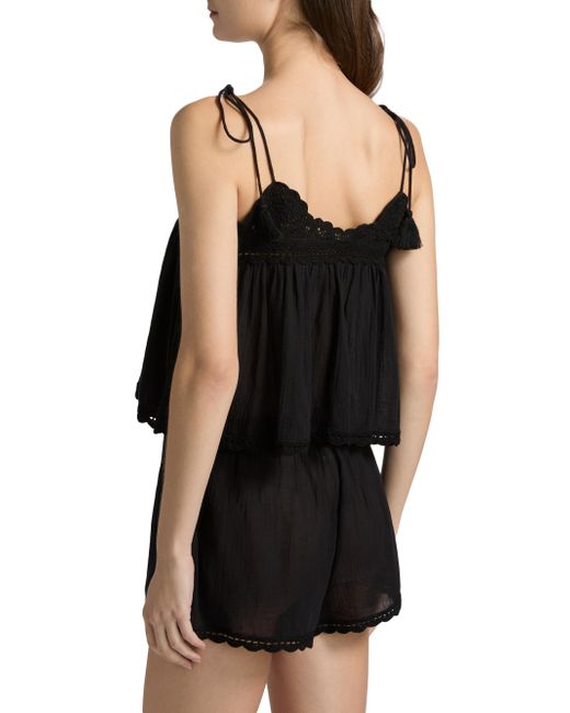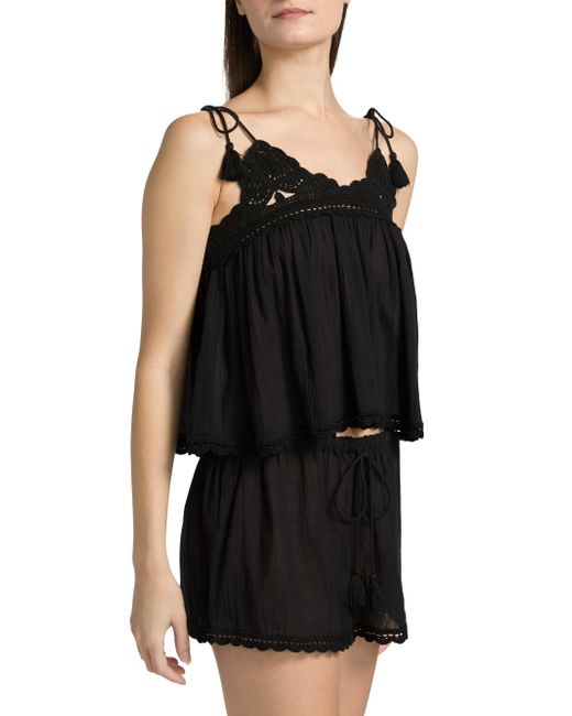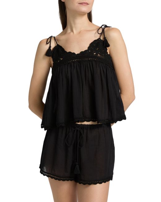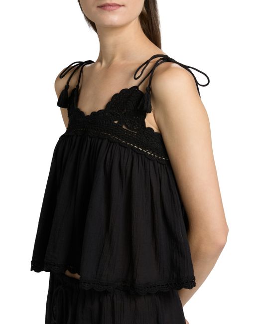 Ulla Johnson's Bermuda crop top is crafted of cotton and detailed with self-tie spaghetti straps and crochet trim. Self-tie spaghetti straps V-neck Sleeveless Gathered bodice Pulls over 100% cotton Machine wash Imported SIZE & FIT About 22" from shoulder to hem Model measurements: 5'10" tall Model is wearing a US size Small. Outerwear And Swimwear - Contemporary Swim > Ulla Johnson > Saks Fifth Avenue. Ulla Johnson. Color: Noir. Size: XS.