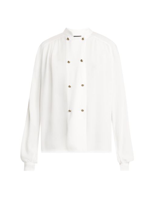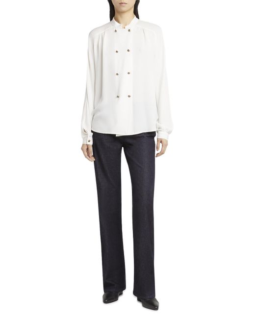 Giorgio Armani's Ouble blouse is crafted in Italy of silk and styled with a band collar and yoked back. Band collar Long sleeves Button-front closure 100% silk Dry clean Made in Italy SIZE & FIT Model measurements: 5'10" tall Model is wearing a US size 4 ABOUT THE BRAND Since launching his self-named fashion empire in 1975, Milanese designer Giorgio Armani has both revolutionized women's and men's fashion, and the fashion industry writ large. His now signature silhouettes forged new directions at the time, with more natural fits and neutral colors. To this day, the Armani name is synonymous with an effortless and approachable Italian aesthetic that can be found in its expertly tailored clothing, accessories and beauty collections. Advanced European - B30 Consignment > Giorgio Armani > Saks Fifth Avenue. Giorgio Armani. Color: White. Size: 6.