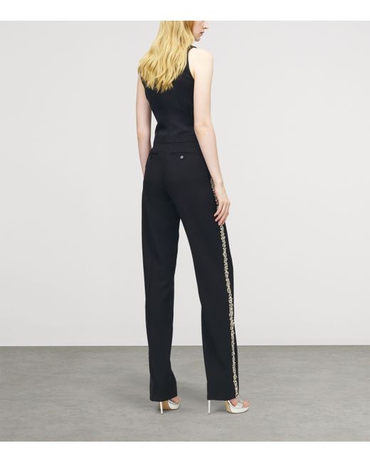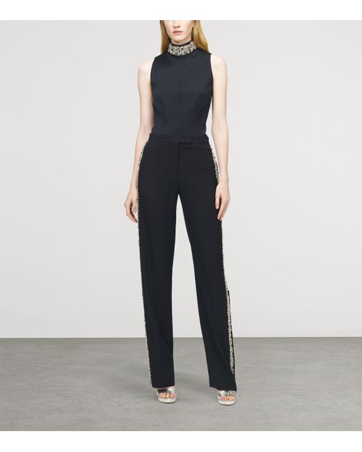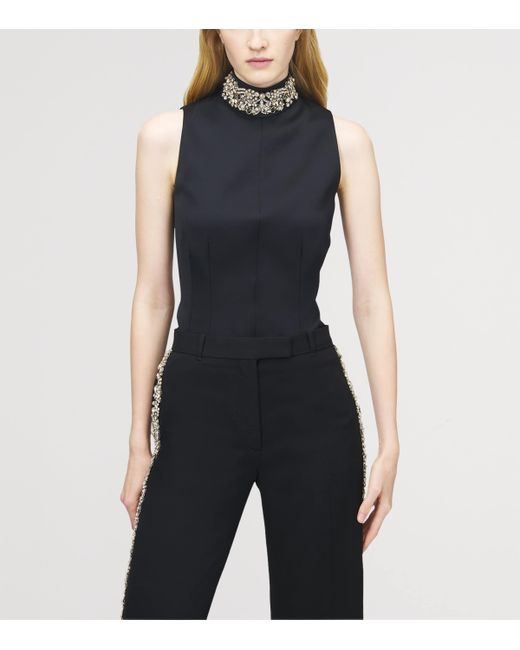 Adhering to its signature penchant for sartorial silhouettes, McQueen offers this high-neck top from its Autumn/Winter 2025 collection. Sharp pleats bring a sculptural finesse to the waist, with the technical performance fabric contrasted by a scintillating crystalline neck, complete with rhinestones, bugle beads and metal bullion for a strikingly suave finish.