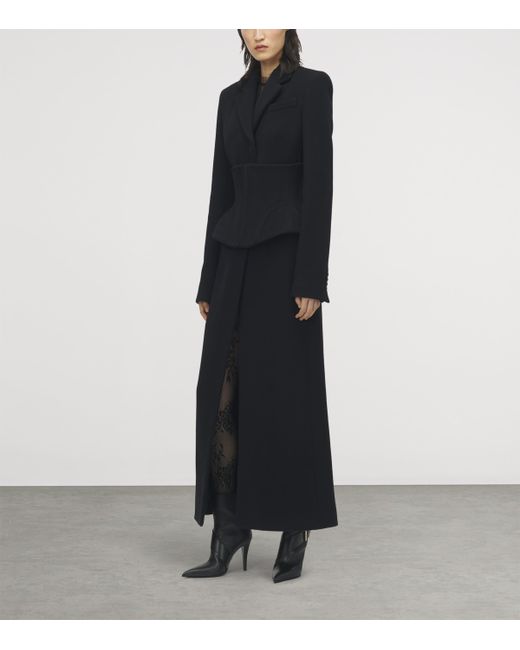 Borrowing from the Victorian gothic movement, McQueen's Autumn/Winter 2025 collection meditates on the notion of the neo-dandy, utilising its codes of tactile artistry and dramatic silhouettes. This coat embodies such design philosophy - presenting sculptural fluidity through a pinched Victorian-inspired corset, it is contrasted by classic sartorial hallmarks, including double breasting and sharp pleats, each working in harmony to create a sophisticated piece of outerwear with an avant-garde flair.