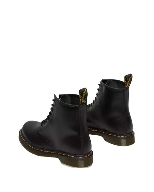 Black faux leather boots from Dr.Martens featuring a round toe, a front lace-up fastening, curved paneling to the sides, a contrasting yellow pull tab at the opening and a nude ribbed rubber sole with yellow stitching.