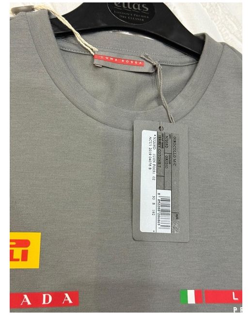 The Prada Pirelli Luna Rossa T-shirt is a stylish and high-quality piece that features a round neckline and short sleeves, making it perfect for the spring season. Made from cotton and machine washable, this grey t-shirt is adorned with the iconic PRADA logo, giving it a touch of designer elegance. With a regular fit and size S, it is suitable for both men and women who appreciate fashionable designer clothing. Perfect for casual wear or adding a sporty edge to your outfit, this t-shirt is a versatile addition to any wardrobe. Never Worn Brand New
