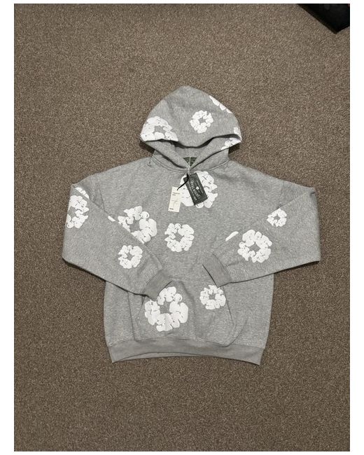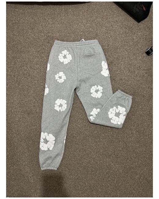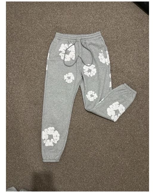 The Grey Denim Tears Tracksuit in size L is a stylish and comfortable two-piece set perfect for men. Made from cotton denim with a floral pattern, this pullover tracksuit features long sleeves and a logo accent. The midweight fabric ensures a regular fit, making it ideal for spring activewear occasions. Machine washable for easy care, this hoodie and trousers set from the brand DENIM TEARS offers a trendy and versatile addition to any wardrobe.
