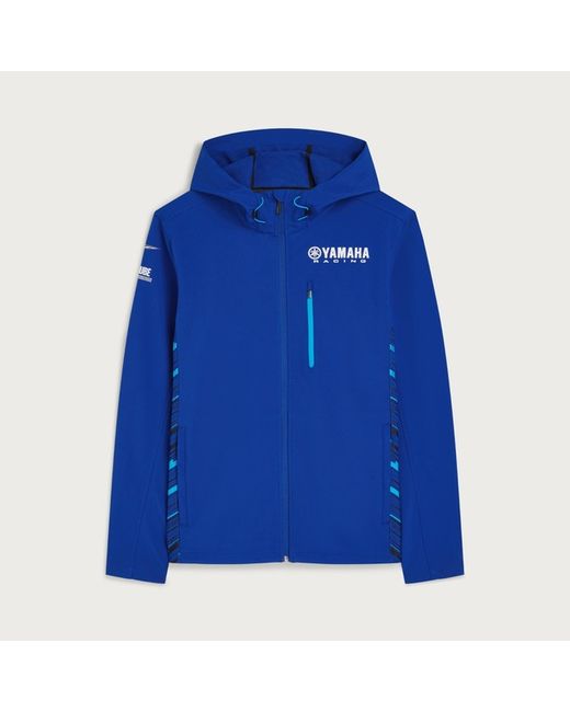 96% polyester, 4% spandex softshell fabric, fleece inside. Embroidered Yamaha Racing logos on chest and sleeve. Lined Hood.