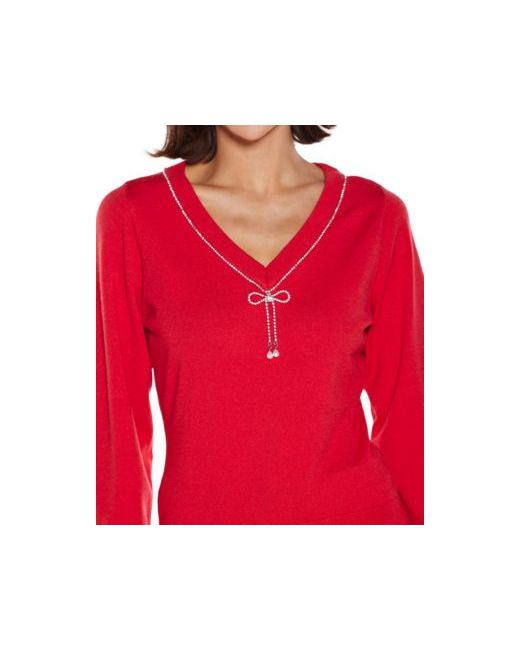 Women's Red V-Neck Rhinestone-Bow Sweater