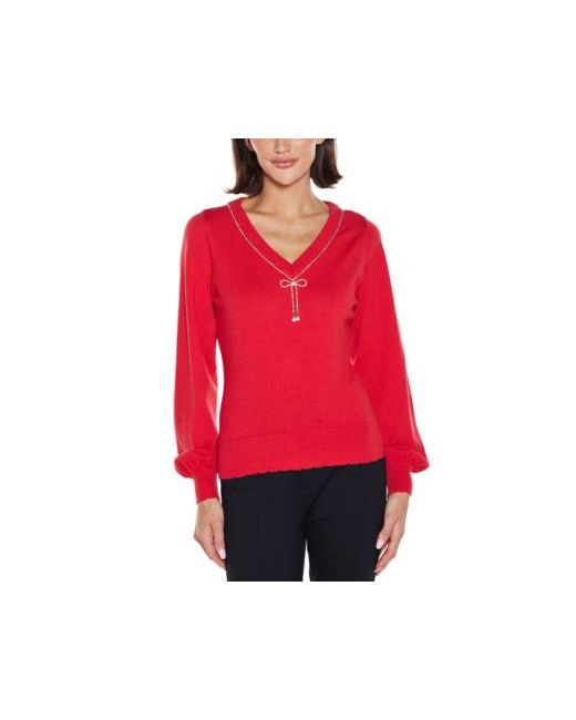 A chic update to the classic V-neck sweater, this style features blouson sleeves, scalloped high-rib trim at the hem and cuffs, and a silver-tone rhinestone chain with bow embellishment at the neckline.