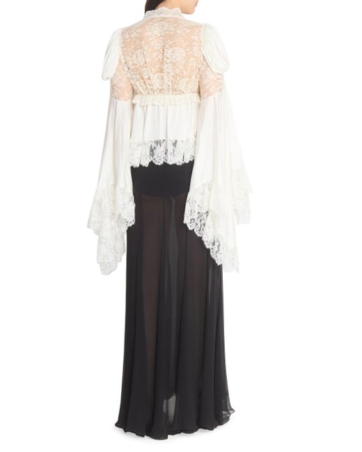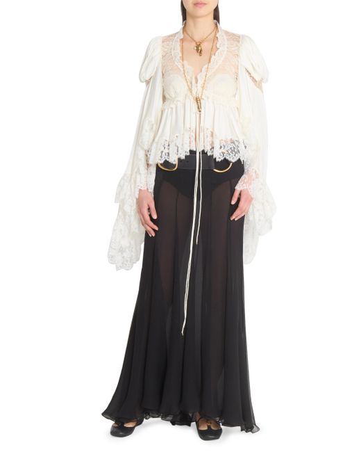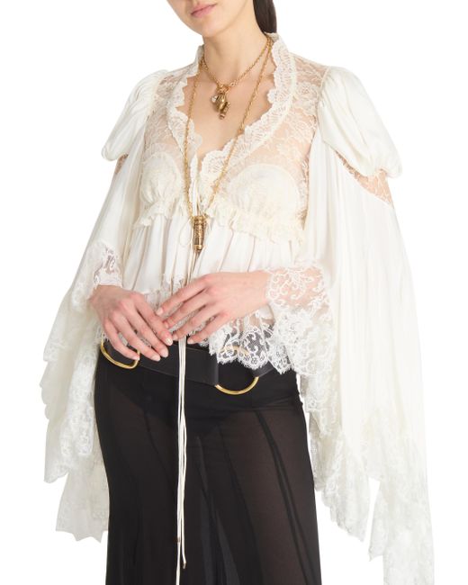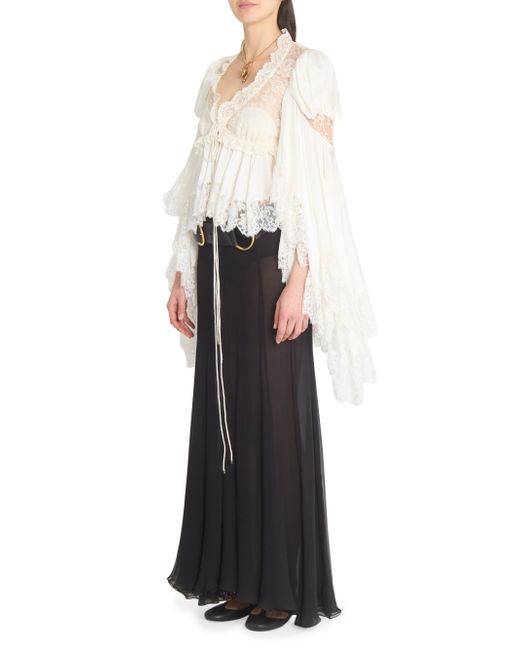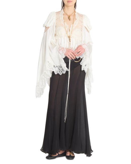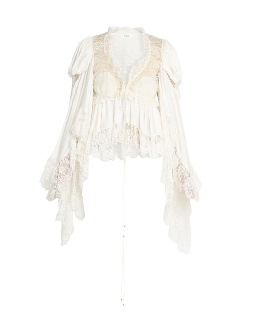 In this collection, Chloé's Creative Director Chemena Kamali channels a romantic, bohemian spirit by blending flowing lace, tiered silhouettes, and heritage tailoring with modern strength and layered femininity. The lineup embraces the tension between softness and structure, tradition and evolution, reflecting the multifaceted identities of today's women through a nostalgic yet forward-facing lens. Crafted of silk, this Chloé blouse features panels of intricate floral lace and ruffled trim. Billowing bell sleeves and a tie-front closure lend romantic shape to this bohemian silhouette. V-neck Long bell sleeves Lace trim Tie-front closure 100% silk Dry clean Imported SIZE & FIT Model measurements: 5'10" tall Model is wearing a US size 4 ABOUT THE BRAND In 1952, founder Gaby Aghion established Chloé as an alternative to couture, and to appeal to the aspirations and empowerment of women. The label is now led by Creative Director Chemena Kamali, who furthers its signature aesthetic of cool, French-girl style. Advanced Designer - Chloe Rtw > Chloé > Saks Fifth Avenue. Chloé. Color: Iconic Milk. Size: 2.