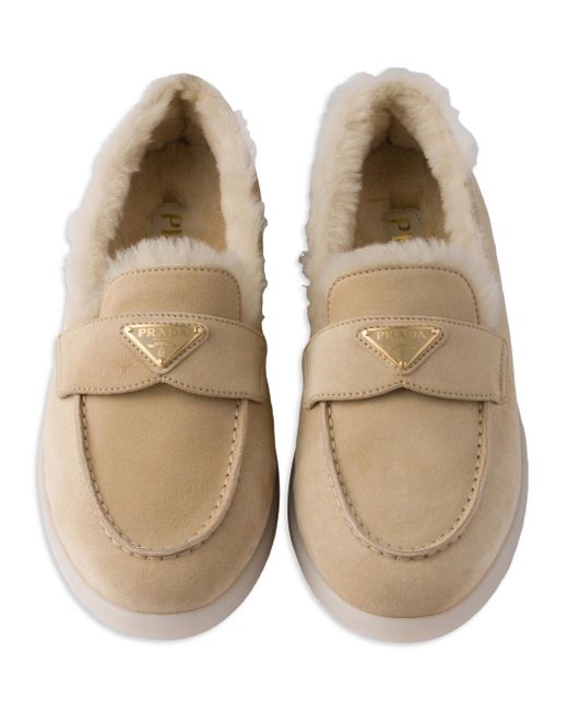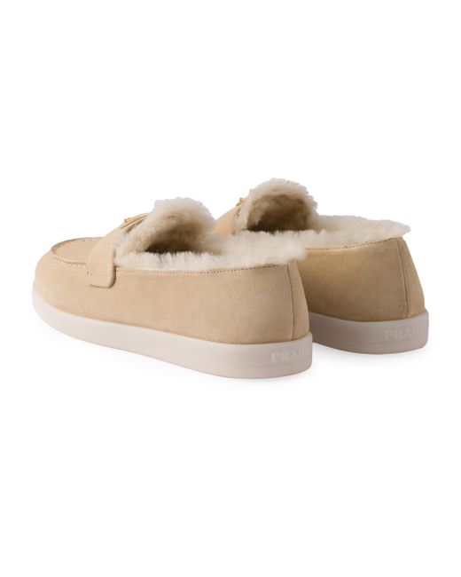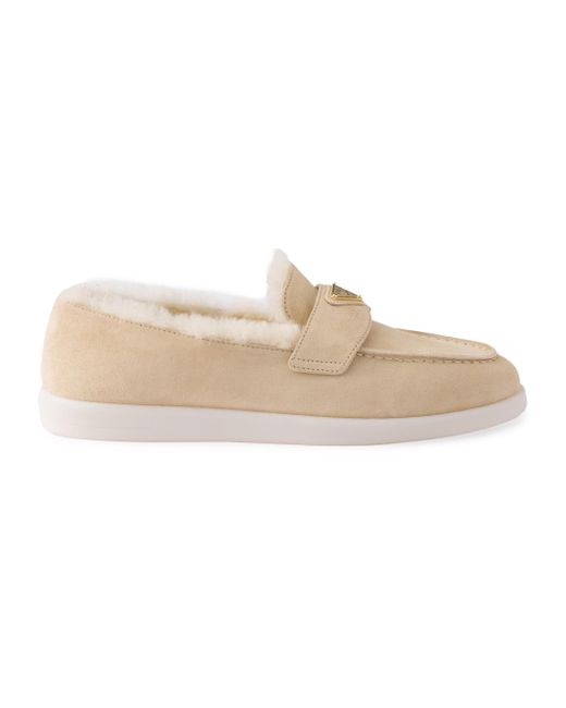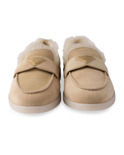 Upper with leather band Shearling lining Enameled metal triangle logo Rubber soles, 25 mm / 0.9'' Fur type: Sheep Fur origin: Portugal, treatment type: Dyed Shearling insole Imported 100% Calf leather. Lsd Rtw - Prada Rtw > Prada > Saks Fifth Avenue. Prada. Color: Beige Khaki. Size: 7.