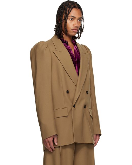 Wool twill blazer. · Peaked lapel · Double-breasted button closure · Flap pockets · Gathering at padded shoulders · Welt pockets at interior · Full cupro lining Supplier color: Tan