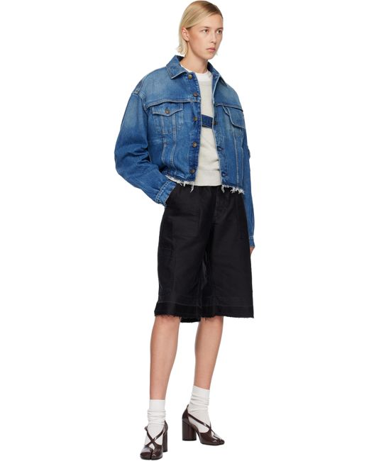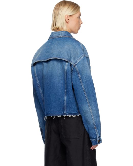 Non-stretch denim jacket. · Fading and whiskering throughout · Spread collar · Button closure · Flap pockets at chest · Seam pockets at waist · Frayed edge at hem · Flap pocket at sleeve · Buttoned barrel cuffs · White stitching at back collar · Zipper detailing at back yoke Supplier color: Vintage medium blue