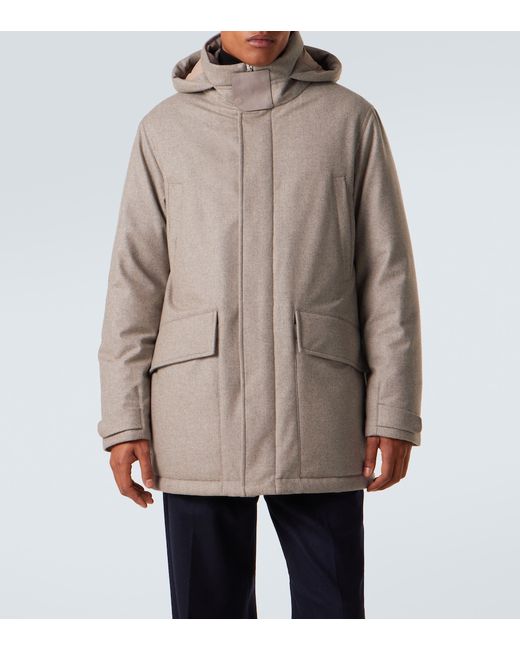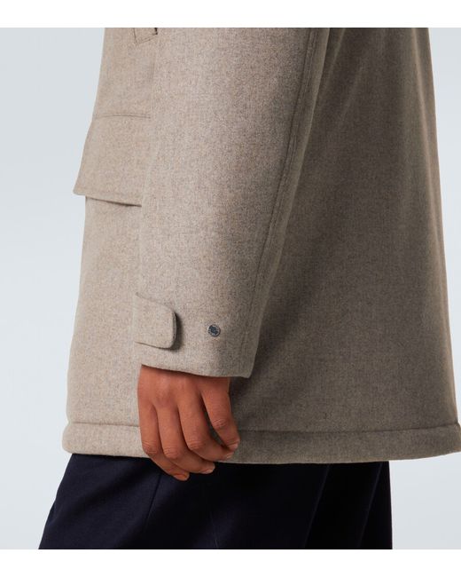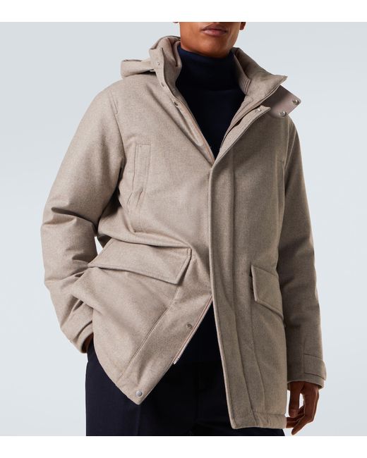 Material: 100% wool. Care instructions: dry clean. Made in Romania. Designer color name: Light Taupe. Item color: beige. Lining: 86% polyamide, 14% elastane. Pocket lining: 100% silk. Filling: 90% down, 10% goose feathers. Contains non-textile parts of animal origin. Closure: two-way zipped front with snap-button fastenings. Pockets: snap-buttoned pockets. Cuff: tab cuff. Hood. Wool.