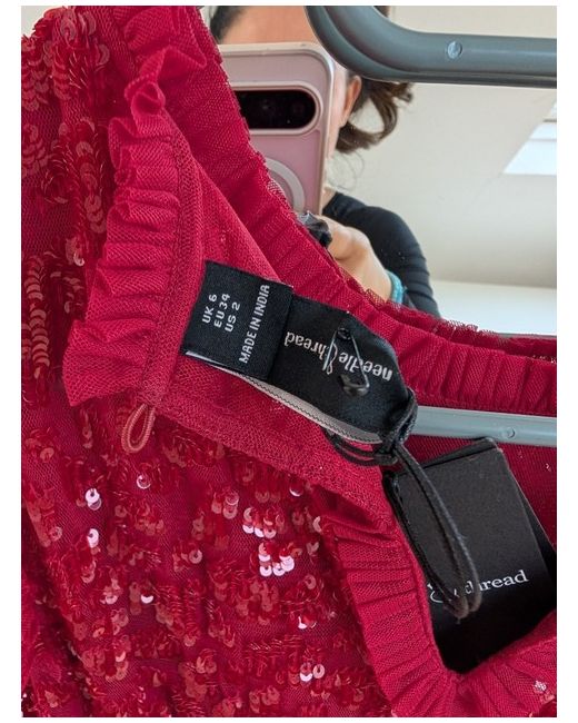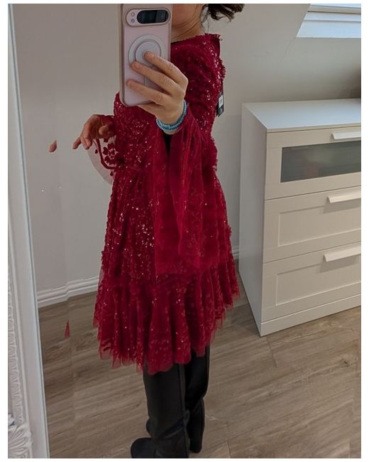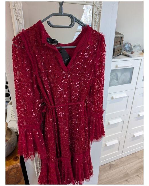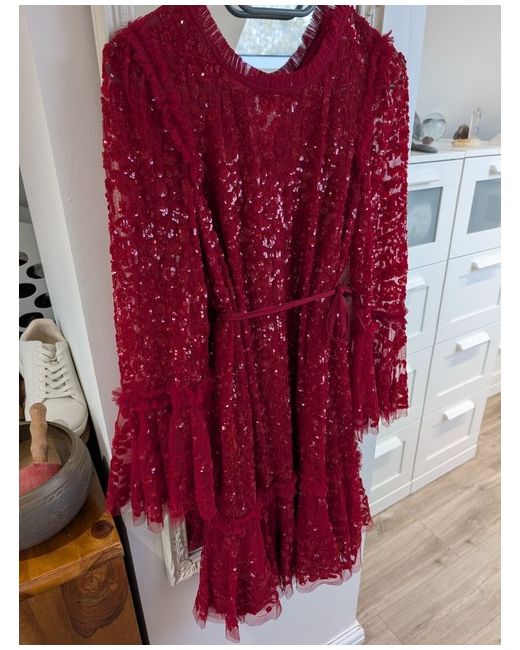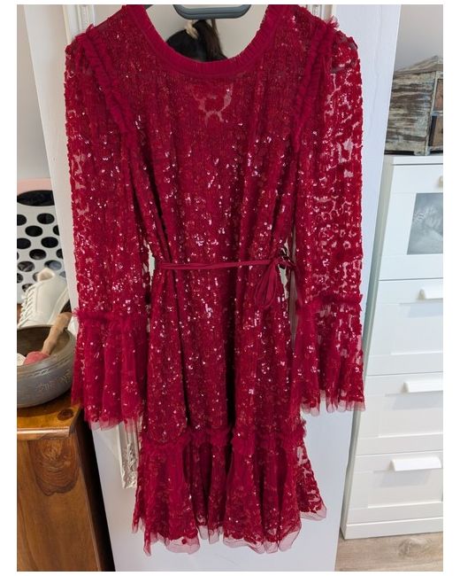 This Needle and Thread women's dress in size 6/8 features a floral pattern in a vibrant cerise red colour, perfect for party or cocktail occasions. Purchased for £400 but never actually used. Although the tag indicates to be a size 6 it can easily fit an 8