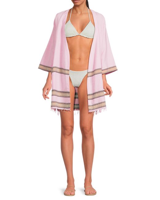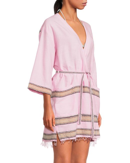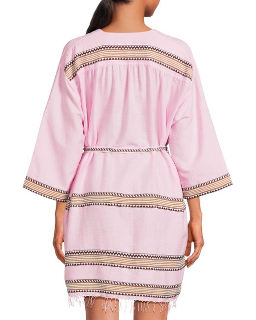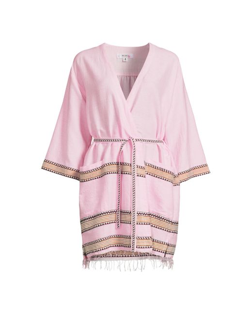 Crafted of handwoven jacquard, this Imani robe from Lemlem features a three-quarter-length sleeve design with a self-belt and front patch pockets. Made with organic cotton V-neck Three-quarter-length sleeves Side patch pockets Self-belt 95% organic cotton/5% rayon Hand wash Imported SIZE & FIT About 34" from shoulder to hem Model measurements: 5'10" tall Model is wearing a US size Small ABOUT THE BRAND A resortwear brand driven by artisans, lemlem was created with the mission to preserve local weaving traditions in Ethiopia and inspire economic growth throughout Africa. Meaning "to flourish" in Amharic, lemlem brings its positive spirit into handwoven warm-weather clothing, infusing vibrant colors and punchy prints-including signature stripes-into its pieces. Outerwear And Swimwear - Contemporary Swim > Lemlem > Saks Fifth Avenue. lemlem. Color: Munit Pink. Size: XS.