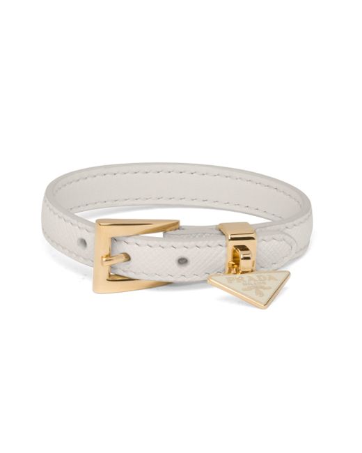 This elegant Saffiano leather bracelet decorated with a metal triangle logo charm stands out for its feminine design. Metal buckle closure Logo loop with enameled metal triangle charm Hypoallergenic and nickel-free materials Imported SIZE 1'' W x 1'' H. Lsd Rtw - Prada Rtw > Prada > Saks Fifth Avenue. Prada. Color: Beige Khaki. Size: Small.