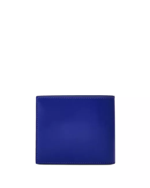 blue calfskin tonal stitching embossed logo to the front bi-fold design internal note compartments internal card slots