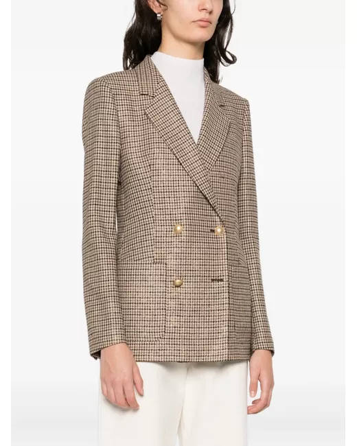 brown check pattern double-breasted gold-tone buttons notched lapels flap pockets