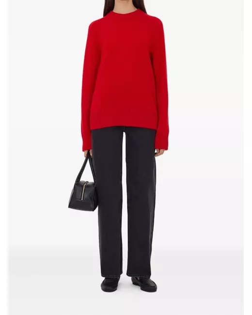 red cashmere drop shoulders ribbed neckline ribbed hem