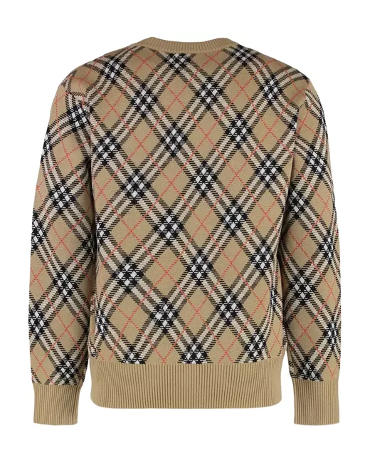 beige check pattern crew neck long sleeves ribbed hem wool blend
