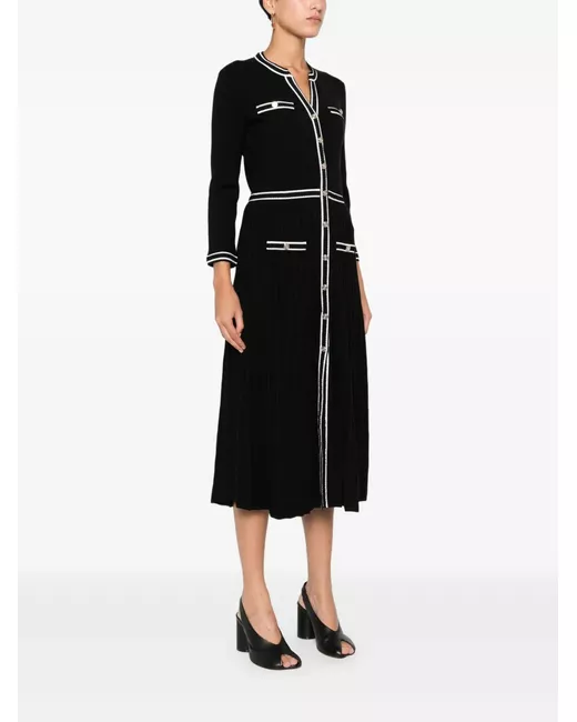 black pleated skirt button front white trim three-quarter sleeves four front pockets