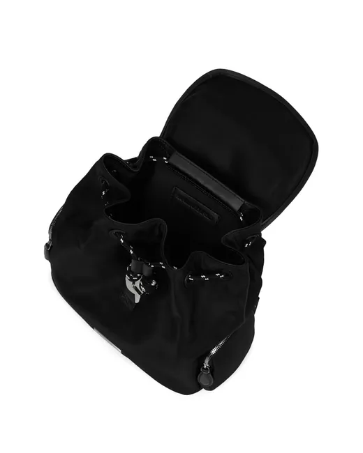 black front flap closure top handle adjustable shoulder straps drawstring fastening side zip pockets