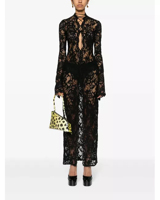 black lace detailing semi-sheer construction long sleeves cut-out detailing with lace-up fastening front slit no lining straight hem