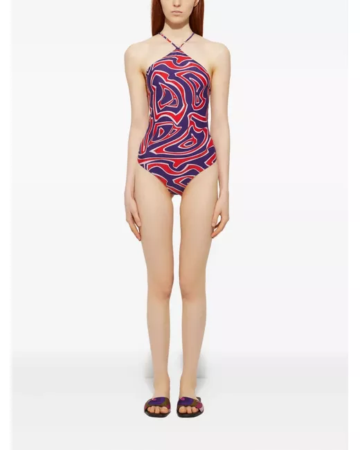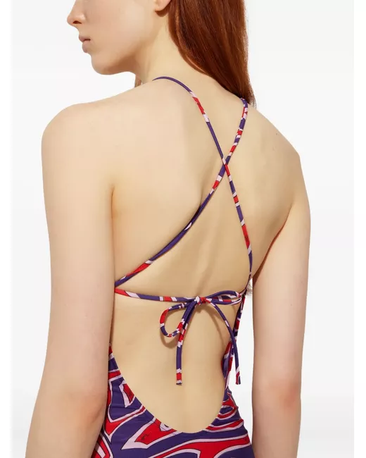 purple print criss-cross straps tie fastening open back Be mindful to try on swimwear over your own garments.