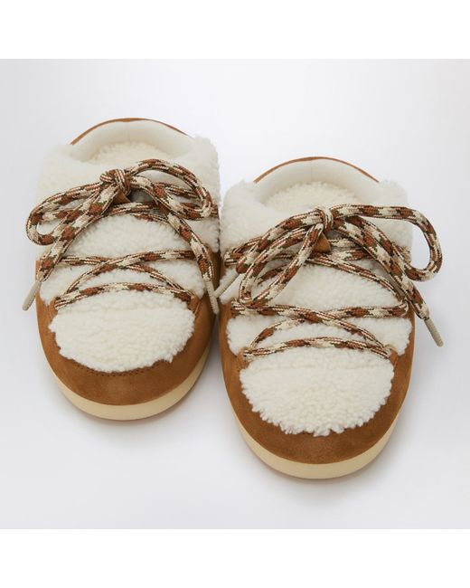 Mules by Moon Boot with a white shearling upper and brown suede trims, featuring a slip-on, ambidextrous design, printed logo on the heel, silver-tone metal eyelets, crossed tubular laces, thermoplastic rubber midsole, and non-slip thermoplastic rubber outsole.