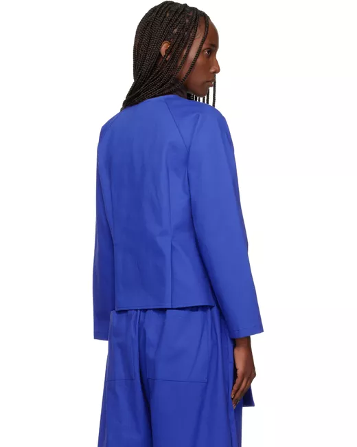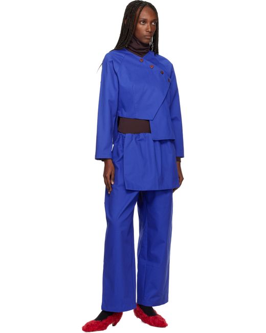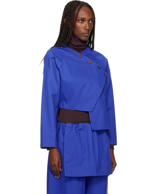 Cotton drill blouse. · V-neck · Offset button closure · Pleats at front and back · Asymmetric hem · Raglan sleeves Supplier color: Bleu