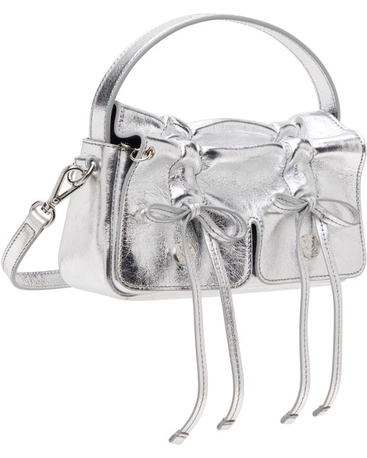 LWG-certified crackled calfskin top handle bag. · Logo embossed at adjustable shoulder strap · Detachable crossbody strap · Logo charm and drawstrings at face · Patch pocket at back face · Magnetic flap · Card slot at interior · Buffed faux-leather lining · H4 x W8.5 x D2.5 Supplier color: Silver