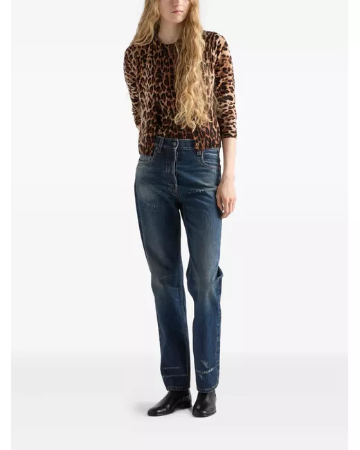 brown animal print triangle logo ribbed crew-neck front button closure three-quarter length sleeves