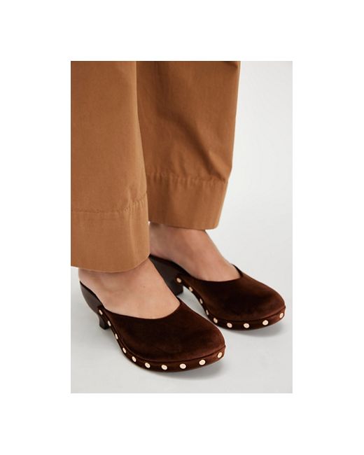 Or a " cloguette," as one could put it: These mule heels from Jeffrey Campbell feature a clog-inspired toe, with studs and all, and a sculpted wood-finished heel for the perfect subtle dose of groovy style. **Features:** Slip-on style, backless design, leather uppers, round toe, clog-inspired design, studded accents, sculpted heel, wood-esque finish, lined footbed **Why We ❤ It:** Perfectly paired with your best denim or a billowy maxi skirt. Blakeney Mini Clogs by Jeffrey Campbell at Free People in Brown Velvet, Size: US 7.5