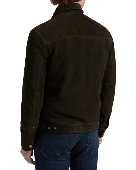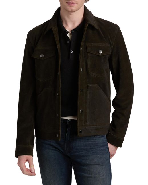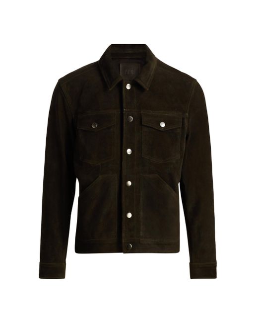 Crafted of suede, Paige's Rubino jacket features classic trucker styling with a spread collar and multiple pockets. A front snap closure completes the design. Spread collar Long sleeves, snap cuffs Chest snap flap patch pockets Side patch pockets Front snap closure 100% leather Dry clean by leather specialist Imported SIZE & FIT About 26.75" from shoulder to hem Model measurements: 6'2" tall, 40" chest, 31" waist Model is wearing a US size Medium. Mens Denim & Contemp - Contemp Denim And Bottom > Paige > Saks Fifth Avenue. Paige. Color: Everglade. Size: Medium.