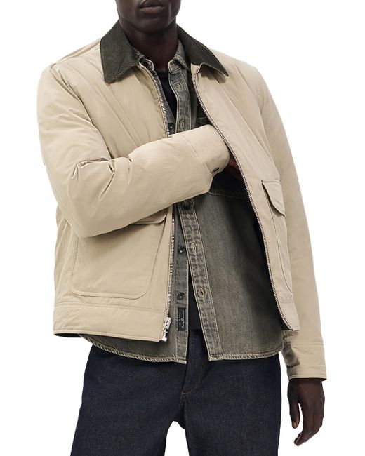 The Derrick jacket from rag & bone features a sleek silhouette with a corduroy spread collar. This piece is adorned with flap pockets at the sides and fastens with front zip closure. Point collar Long sleeves Side flap pockets Front zip closure 65% cotton/35% polyamide Lining: 100% polyester Dry clean Imported SIZE & FIT About 25.75" from shoulder to hem Model measurements: 6'2" tall, 40" chest Model is wearing a US size Medium ABOUT THE BRAND In 2002, rag & bone founder Marcus Wainwright combined his British heritage with a downtown-New York aesthetic to set the tone for the label. At the heart of the edgy-yet-laid-back brand is its focus on quality craftsmanship and attention to detail. The epitome of cool, off-duty style, it's no wonder the signature denim and easy knits are favored by many. Mens Denim & Contemp - Contemp Denim And Bottom > Rag & Bone > Saks Fifth Avenue. rag & bone. Color: Light Metal. Size: Medium.