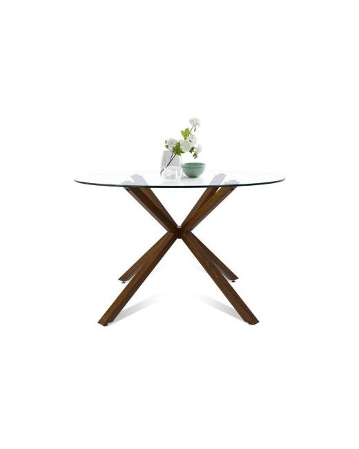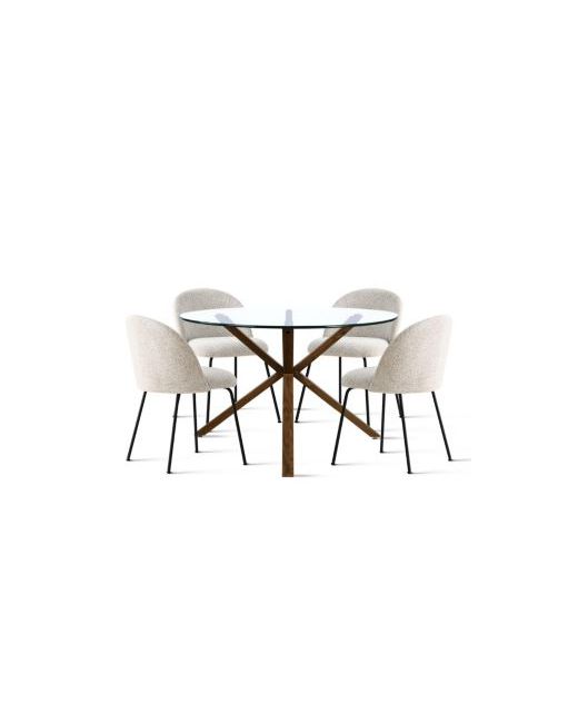 Refresh your dining area with the 5-Piece Round Glass Dining Set. Featuring a tempered glass tabletop and sturdy metal legs in a walnut wood grain finish, this table brings sleek style and durability to your space. Four upholstered dining chairs with curved backs and soft fabric seats offer everyday comfort and a minimalist look. Perfect for small dining rooms, breakfast nooks, or apartments, this compact set saves space while adding modern charm. Whether you're hosting guests or enjoying a quiet breakfast, this set fits your lifestyle beautifully.