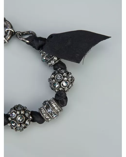 Silver-tone brass bracelet from Lanvin featuring a chunky clip fastening with a logo engraved ball charm, gem encrusted beaded detailing and a contrasting black silk ribbon weave.