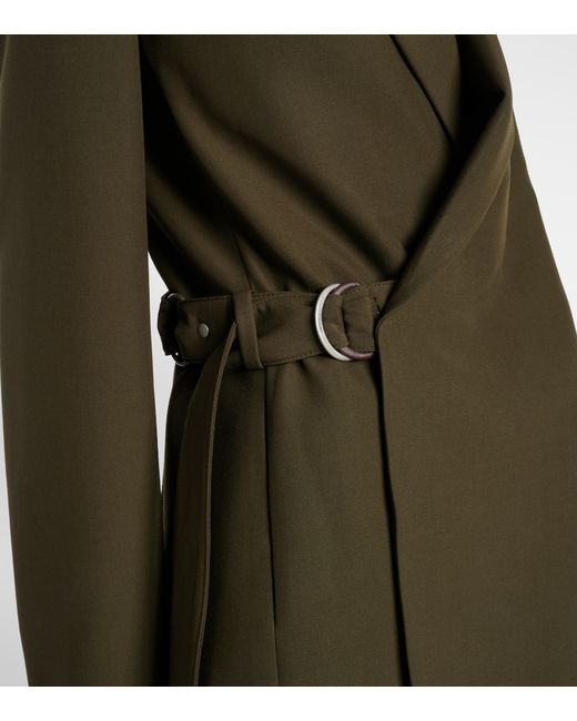 Material: 100% wool. Care instructions: dry clean. Made in Italy. Designer color name: Khaki Green. Item color: green. Lining: 100% viscose. Details: 100% calf leather. Contains non-textile parts of animal origin. Wool. Attached belt. Shoulder pads. Peak lapel. Cuff: three buttons. Closure: belted waist.