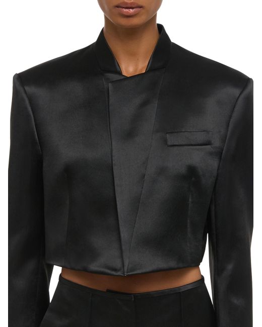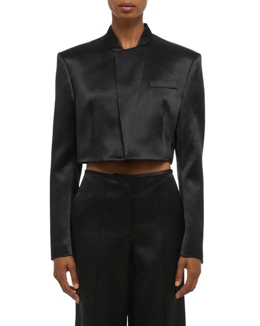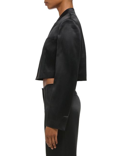 This cropped blazer from Helmut Lang, crafted of satin, is styled with a revers collar, a chest welt pocket, and an open-front design. Revers collar Long sleeves Chest welt pocket Slips on 100% acetate Lining: 100% viscose Dry clean Imported SIZE & FIT About 17" from shoulder to hem Model measurements: 5'10" tall Model is wearing a US size 4. Contemporary Sportswear - Helmut Lang > Helmut Lang > Saks Fifth Avenue. Helmut Lang. Color: Black. Size: 00.