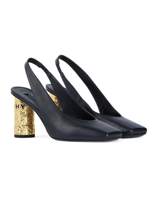 Tape slingbacks in leather. Slingback pumps in calfskin leather Tape line Low décolleté Thin ankle strap with metal buckle Givenchy label on the leather insole Squared toe Thick heel covered in textured golden-finish metal, featuring Givenchy Paris 1952 in black enamel Pads in rubber on the outsole to prevent sliding Heel height: 3.3 in. Composition: 100% calfskin leather Lining: 100% cowhide leather Made in Italy. Lsd Rtw - Givenchy Rtw > Givenchy > Saks Fifth Avenue. Givenchy. Color: Black. Size: 5.
