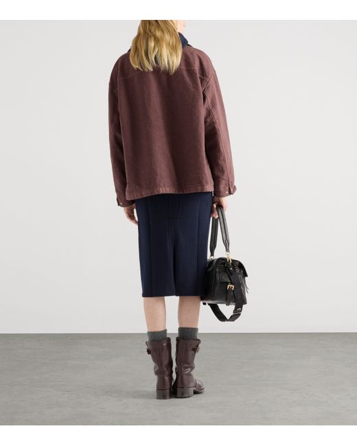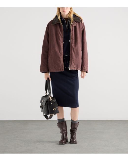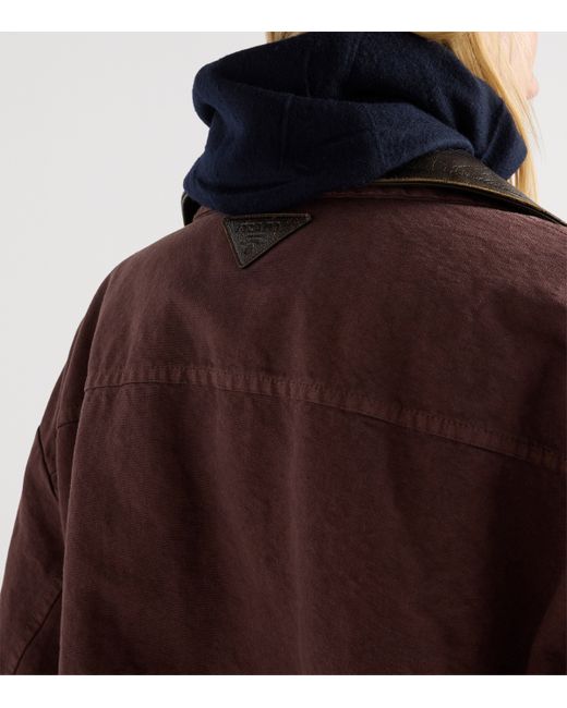 This Caban jacket from Prada reworks a utilitarian silhouette with a tactile, aged elegance, making a statement through its material contrasts. Note the heavily worn, crinkled leather collar, providing a rugged yet refined texture against the subtly faded fabric of the body.