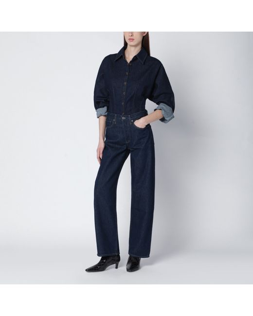AGOLDE shirt in dark indigo regenerated cotton denim, featuring front button closure, long sleeves with buttoned cuffs, visible stitching, classic collar, and fitted waist design.