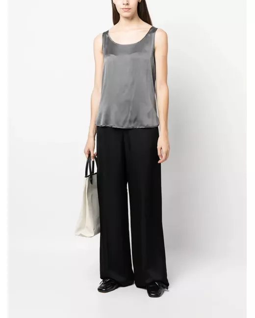 ash grey stretch-silk satin finish side slits square neck sleeveless straight hem