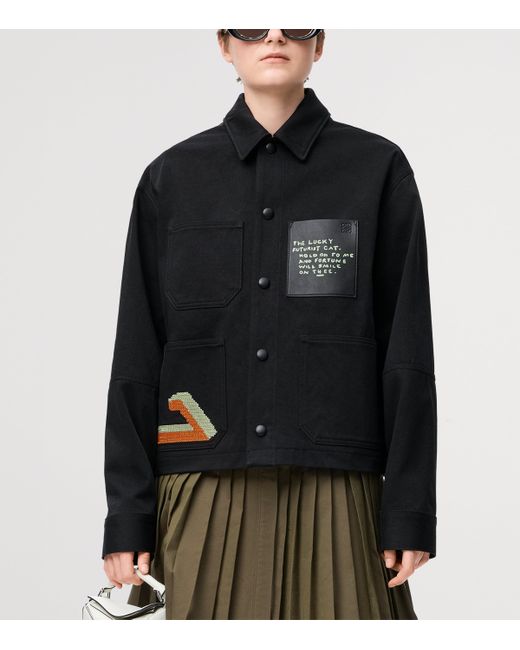 This season, loewe draws inspiration from British artist Louis Wain's Futurist Cats porcelain vase series to create a capsule collection full of playful feline energy. Realised in garment-dyed cotton satin, this jacket pays tribute to the Lucky Futuristic Cat - designed in the early 1910s - with its intricate embroidery and lettering to the leather patch pocket.