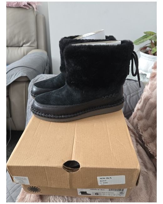 The UGG Women's Boots are a stylish and comfortable choice for the colder seasons. These ankle boots feature a round toe shape, low heel height, and a convenient pull-on closure. The black suede upper material, sheepskin lining, and rubber outsole provide both durability and warmth, making them perfect for casual occasions. The UGG Australia logo adds a touch of accents to these classic booties, which are part of the Ugg Classic product line.