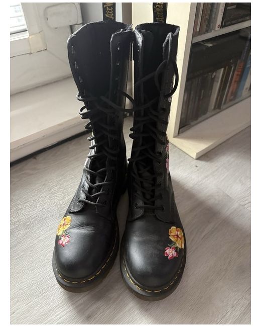 These Dr. Martens Women's Size 6 Boots feature a stylish floral design, adding a touch of feminine flair to the classic combat style. Made from black leather with embroidered accents, these boots combine durability with a fashionable look. With a UK shoe size of 6, these boots are perfect for women who want to make a statement with their footwear.