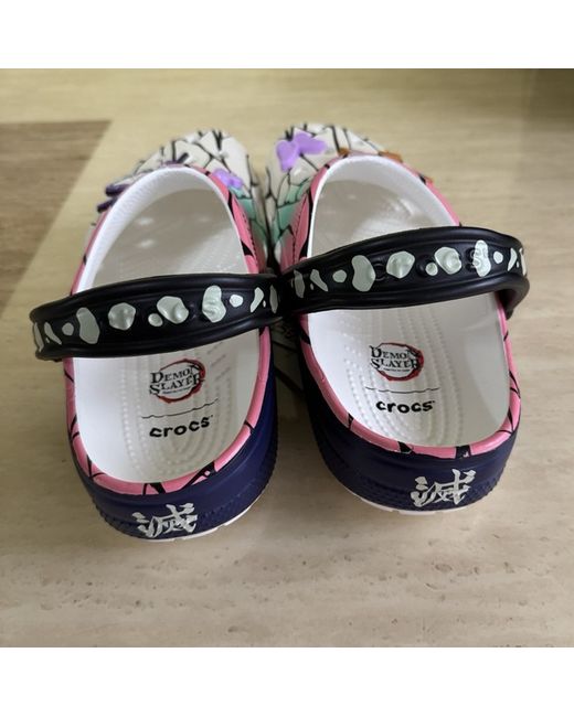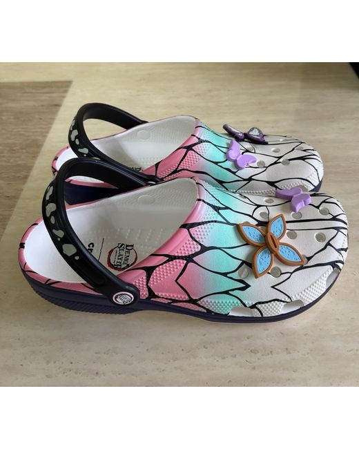 This product is a pair of unisex Crocs clogs in size 10, featuring a classic demon slayer design inspired by the character Shinobu. The multicoloured synthetic clogs are designed for casual wear, with a standard shoe width making them comfortable for everyday use. Perfect for both women and men, these classic Crocs offer a fun and stylish addition to any outfit.