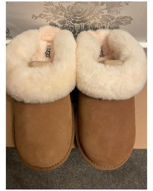 The UGG Women's Cluggette Size 3UK Slippers in Chestnut are stylish and comfortable sandals perfect for lounging around the house. Made by the renowned brand UGG, these slippers feature a brown colour and a slipper style design. With a UK shoe size of 3, these slippers are designed specifically for women to provide a cosy and trendy footwear option.
