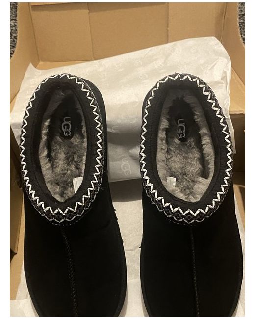 TOP OF BOX SLIGHTLY DAMAGED PLZ LOOK AT PHOTOS These Black UGG Tazzman slippers in UK size 6 are perfect for the winter season. With a round toe shape and standard shoe width, they offer a comfortable and stylish slip-on option for casual occasions. Made from suede, these UGG Australia slippers in black are designed for women and are a great addition to any wardrobe. Whether lounging at home or running quick errands, these UGG Tazzman slippers are a trendy choice for keeping your feet warm and cosy.